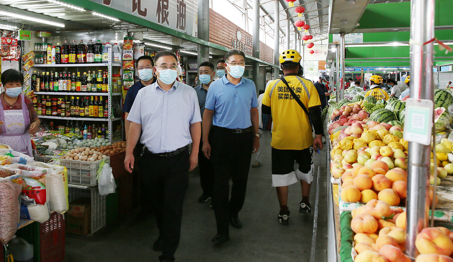 楊龍一行按防疫要求完成體溫測(cè)量、蘇康碼掃碼后,進(jìn)入市場(chǎng)區(qū)域,認(rèn)真察看市場(chǎng)內(nèi)口罩佩戴、掃碼查驗(yàn)、體溫檢測(cè)等基礎(chǔ)防疫措施,仔細(xì)詢問人員管控、防疫消殺等制度落實(shí)情況。查看了解糧油肉蛋奶及水果、蔬菜等重要食品的市場(chǎng)供應(yīng)、保質(zhì)穩(wěn)價(jià)等情況。楊龍指出,農(nóng)貿(mào)市場(chǎng)人員流動(dòng)性大、接觸頻繁,是疫情防控的重要區(qū)域。金航公司要切實(shí)落實(shí)好主體責(zé)任,按照市疫情防控指示精神和集團(tuán)“十排查”“十到位”的要求,嚴(yán)格落實(shí)好各項(xiàng)措施,做好入口人員管理,嚴(yán)格落實(shí)體溫檢測(cè)、佩戴口罩、健康碼掃碼等工作,全面落實(shí)環(huán)境清潔消毒。要嚴(yán)把食品安全關(guān),嚴(yán)格履行相關(guān)手續(xù),確保食品流通各環(huán)節(jié)安全可控。要規(guī)范經(jīng)營(yíng),確保市場(chǎng)食品供應(yīng)充足、價(jià)格穩(wěn)定、消費(fèi)安全。同時(shí)要積極引導(dǎo)群眾和工作人員做好自我防護(hù),保持良好衛(wèi)生習(xí)慣,倡導(dǎo)健康生活方式。