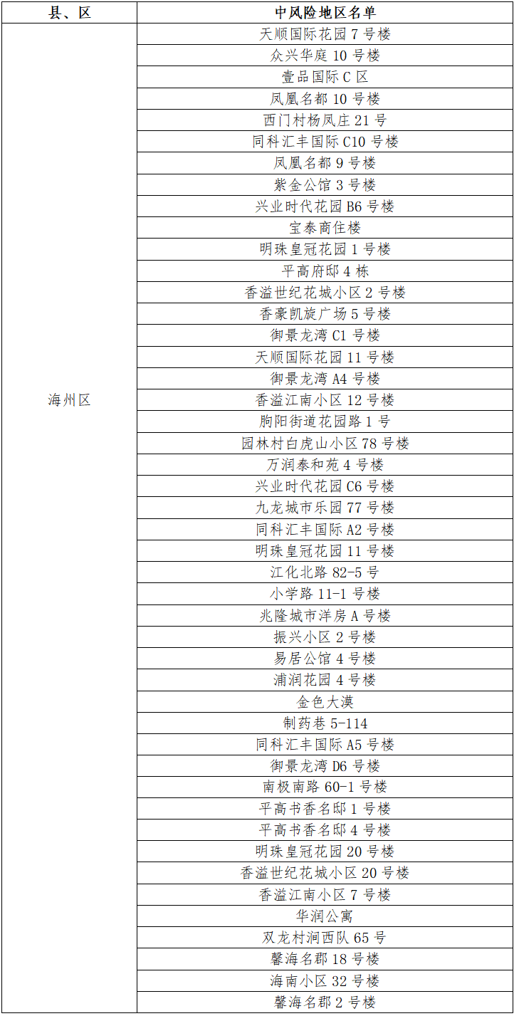 根據(jù)國務(wù)院聯(lián)防聯(lián)控機(jī)制有關(guān)規(guī)定,經(jīng)市指揮部研究決定,自發(fā)布之日起,對我市部分區(qū)域疫情風(fēng)險等級進(jìn)行調(diào)整:海州區(qū)中央華府D1棟、玉蘭國際5號樓、福園名邸3號樓、一品苑44號樓、博威江南明珠苑33號樓、如佳賓館(霞輝路店)、鳳祥銘居7號樓、蒼梧春曉23號樓、龍河小區(qū)25號樓、鷹游水岸花園5號樓、海南小區(qū)34號樓、仕方國際9號樓、茗馨花園18號樓、梧桐藍(lán)山晴園7號樓、富強(qiáng)路疏導(dǎo)點(diǎn)旁三合院、百達(dá)菲力酒吧、通灌南路66號3棟、極美公寓4號樓、路南街道河運(yùn)路35號樓、海連中路151號、興城四號公寓8號樓、青年路55號5棟、東方領(lǐng)秀7號樓、寶翔財(cái)富廣場3號樓、園林村白虎山組王莊隊(duì)13號、津華苑小區(qū)A2號樓、盛世豪庭小區(qū)8號樓、許莊村楊圩北隊(duì)51號、振興公寓6號樓、建欣路1號樓、園林村白虎山小區(qū)100號、路南街道東村巷2號樓、建設(shè)中路76-24號由中風(fēng)險地區(qū)調(diào)整為低風(fēng)險地區(qū)。