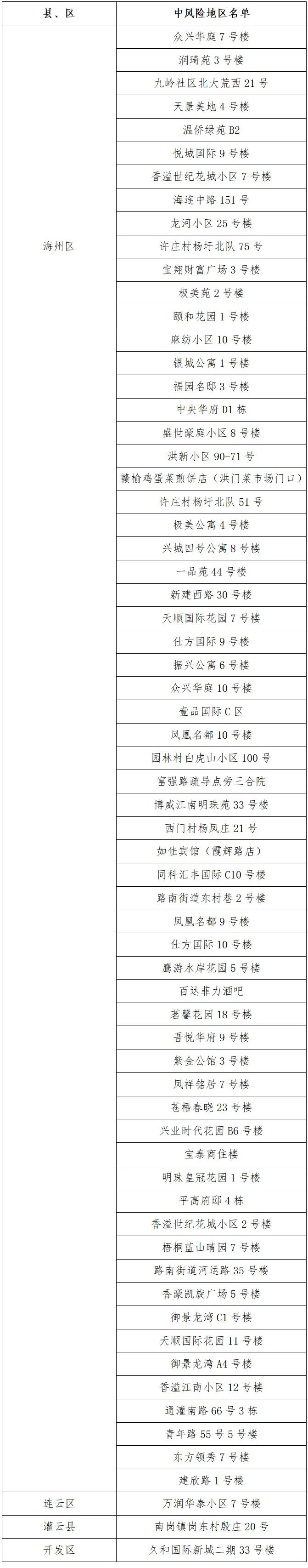 根據(jù)國(guó)務(wù)院聯(lián)防聯(lián)控機(jī)制有關(guān)規(guī)定,經(jīng)綜合評(píng)估研判,市指揮部決定,自發(fā)布之日起,將海州區(qū)茗馨花園18號(hào)樓、吾悅?cè)A府9號(hào)樓、紫金公館3號(hào)樓、鳳祥銘居7號(hào)樓、蒼梧春曉23號(hào)樓、興業(yè)時(shí)代花園B6號(hào)樓、寶泰商住樓、明珠皇冠花園1號(hào)樓、平高府邸4棟、香溢世紀(jì)花城小區(qū)2號(hào)樓、梧桐藍(lán)山晴園7號(hào)樓、路南街道河運(yùn)路35號(hào)樓、香豪凱旋廣場(chǎng)5號(hào)樓、御景龍灣C1號(hào)樓、天順國(guó)際花園11號(hào)樓、御景龍灣A4號(hào)樓、香溢江南小區(qū)12號(hào)樓、通灌南路66號(hào)3棟、青年路55號(hào)5號(hào)樓、東方領(lǐng)秀7號(hào)樓、建欣路1號(hào)樓調(diào)整為中風(fēng)險(xiǎn)地區(qū)。其他地區(qū)風(fēng)險(xiǎn)等級(jí)不變。調(diào)整后全市現(xiàn)有66個(gè)中風(fēng)險(xiǎn)地區(qū)。