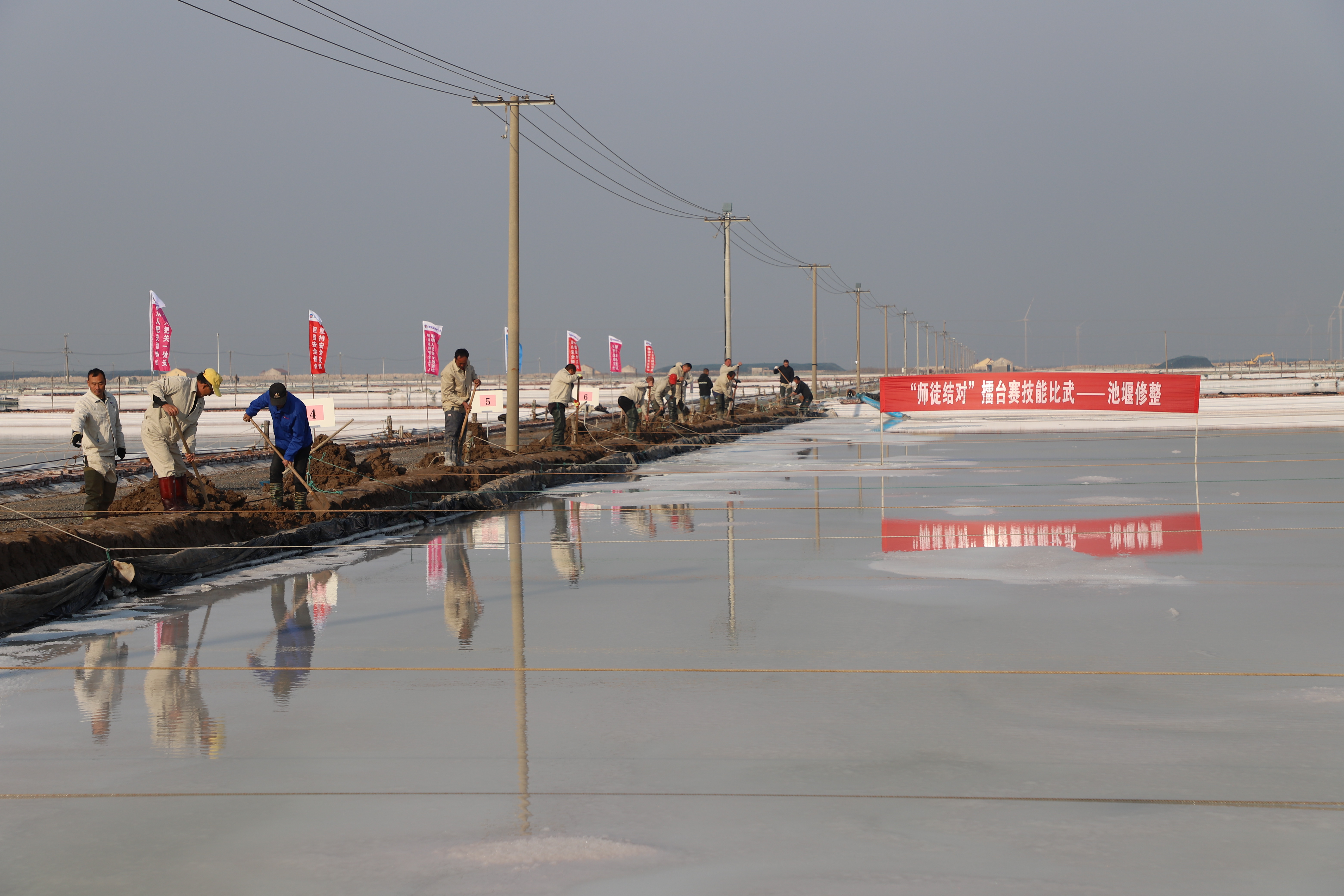 寒冬時(shí)節(jié),暖陽(yáng)之下,鹽廩之旁,曬得黝黑的鹽場(chǎng)產(chǎn)業(yè)工人們按照競(jìng)賽的考核標(biāo)準(zhǔn),做熟泥、打堰墻、做堰頂,護(hù)埝頂、夯埝坡、清塘底,見(jiàn)證了一場(chǎng)技能比拼的盛會(huì)。經(jīng)過(guò)一天的鏖戰(zhàn),盧正兵、靳新邦、匡洪忠?guī)熗饺〉昧顺匮咝拚那叭涣謽?shù)軍、潘成軍、胡繼華師徒取得了土塘清淤的前三名。(西工)