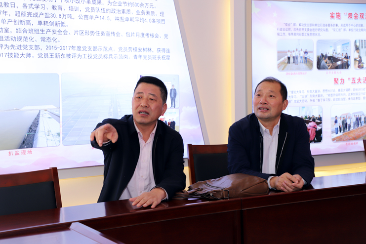 檢查組一行先后到新河制鹽分公司、老機(jī)關(guān)新建黨建室進(jìn)行實(shí)地檢查驗(yàn)收,在新河制鹽分公司黨建活動(dòng)室,江舜軍部長(zhǎng)一行詳細(xì)聽(tīng)取了該黨支部書(shū)記李加新對(duì)黨建工作的匯報(bào),隨后,在老機(jī)關(guān)綜合黨員活動(dòng)中心,檢查組一行利用活動(dòng)室電子顯示屏觀看了集團(tuán)司歌視頻。