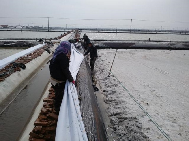 新河制鹽分公司為了盡快改善食用鹽基地面貌,減少池埝上固化紅磚風(fēng)化,沙塵落入鹽池內(nèi),對池鹽的污染,近期組織分公司職工,對基地塑池的紅磚固化池埝進行處理,先用黑塑布把池埝重包一遍,然后再用土工布苫好。有效地減少了雜物落入池鹽中,為產(chǎn)合格食用鹽提供了良好生產(chǎn)環(huán)境。(圖為職工們正在苫蓋紅磚固化池埝。)