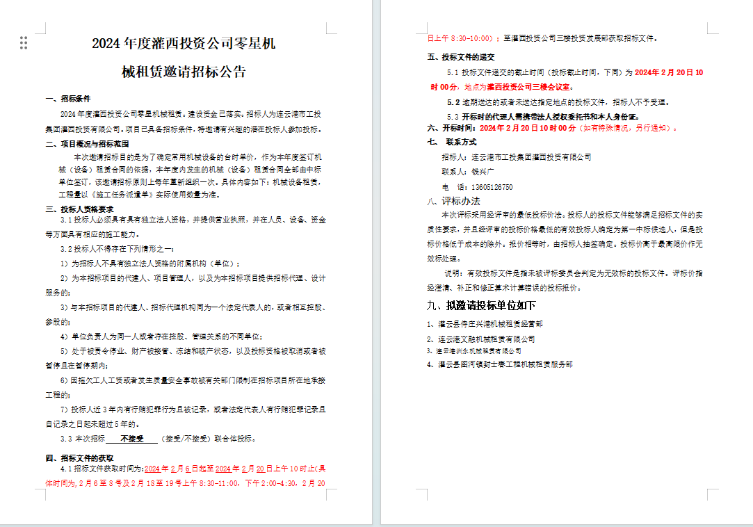 2024年度灌西投資公司零星機 械租賃邀請招標公告