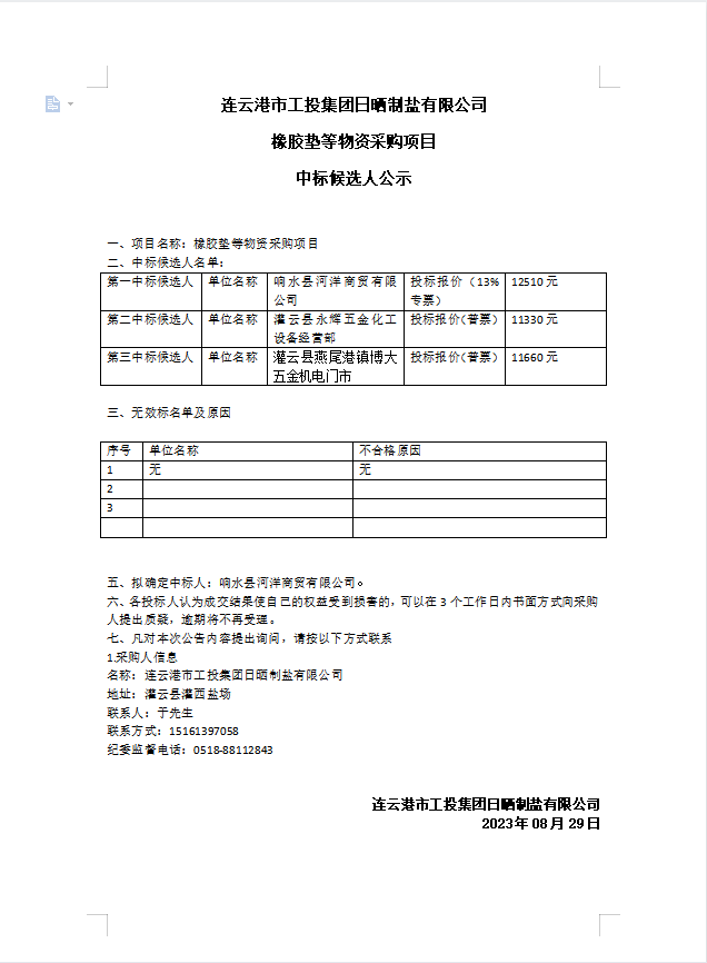 連云港市工投集團(tuán)日曬制鹽有限公司橡膠墊等物資采購項(xiàng)目中標(biāo)候選人公示