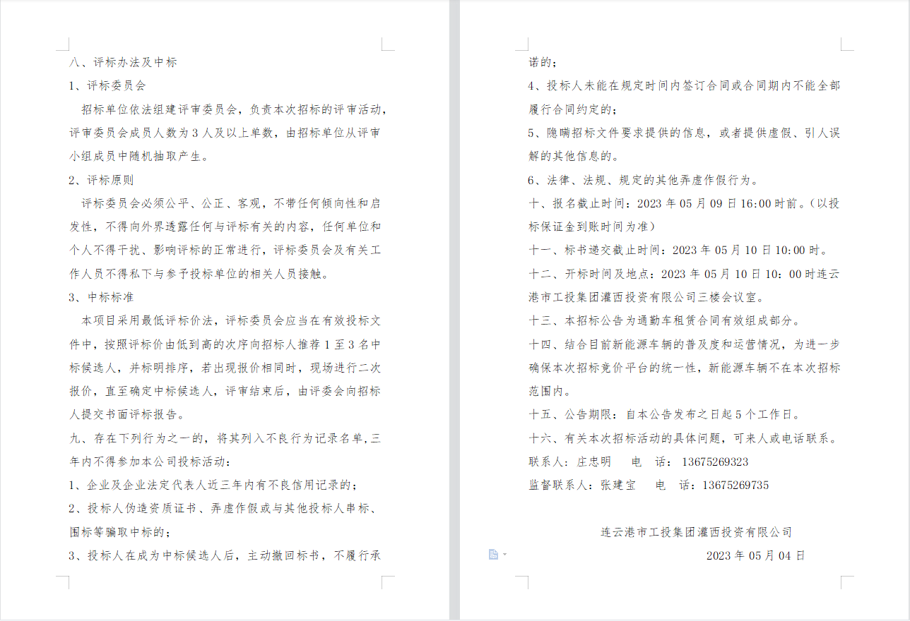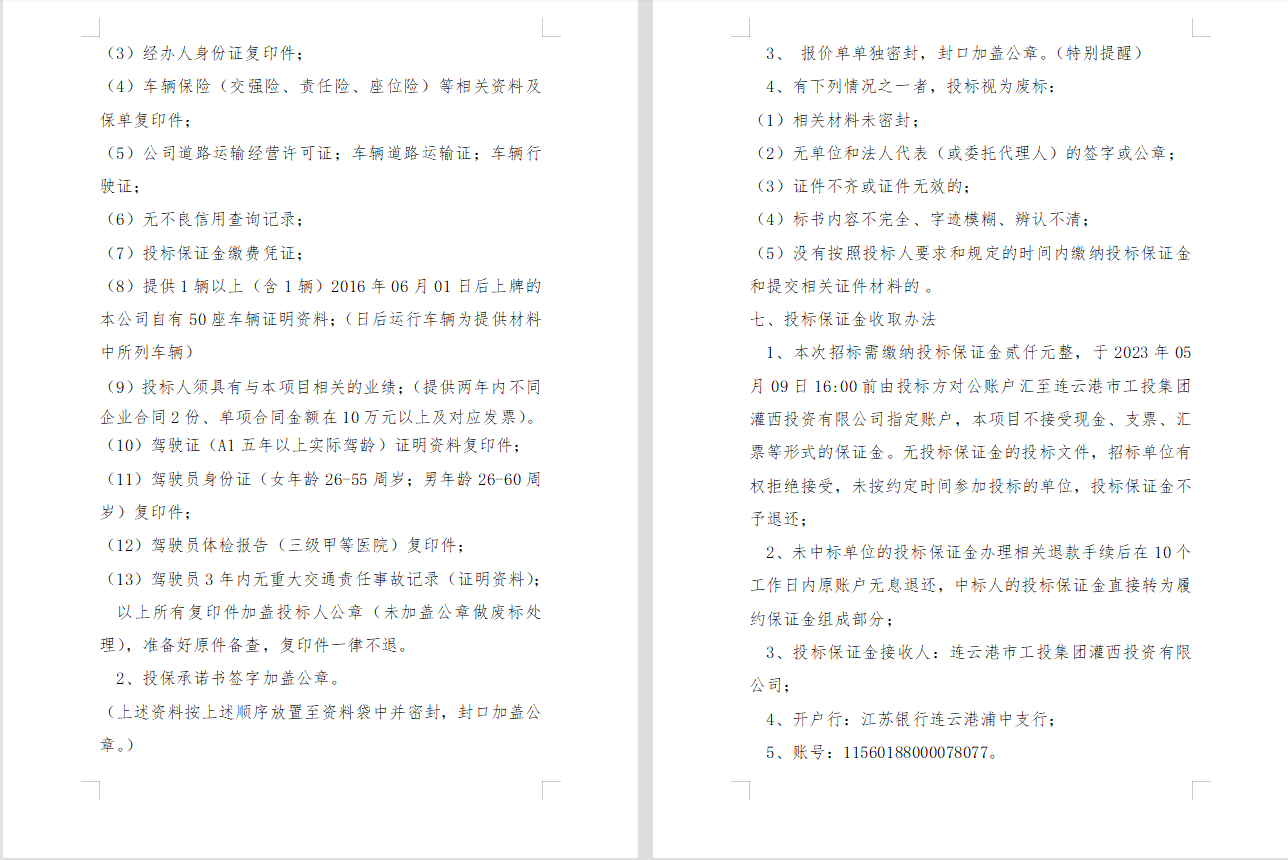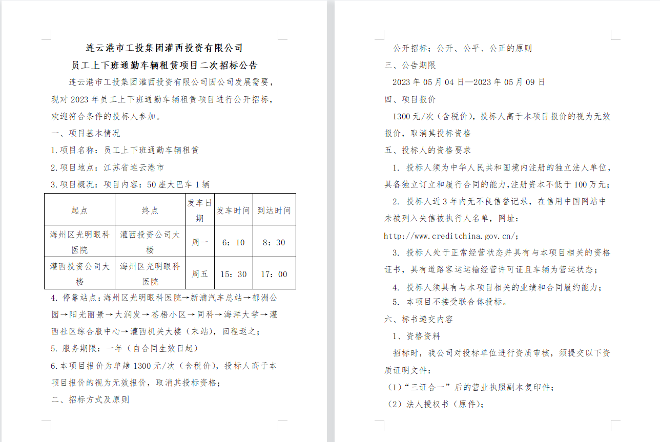 連云港市工投集團(tuán)灌西投資有限公司 員工上下班通勤車輛租賃項目二次招標(biāo)公告