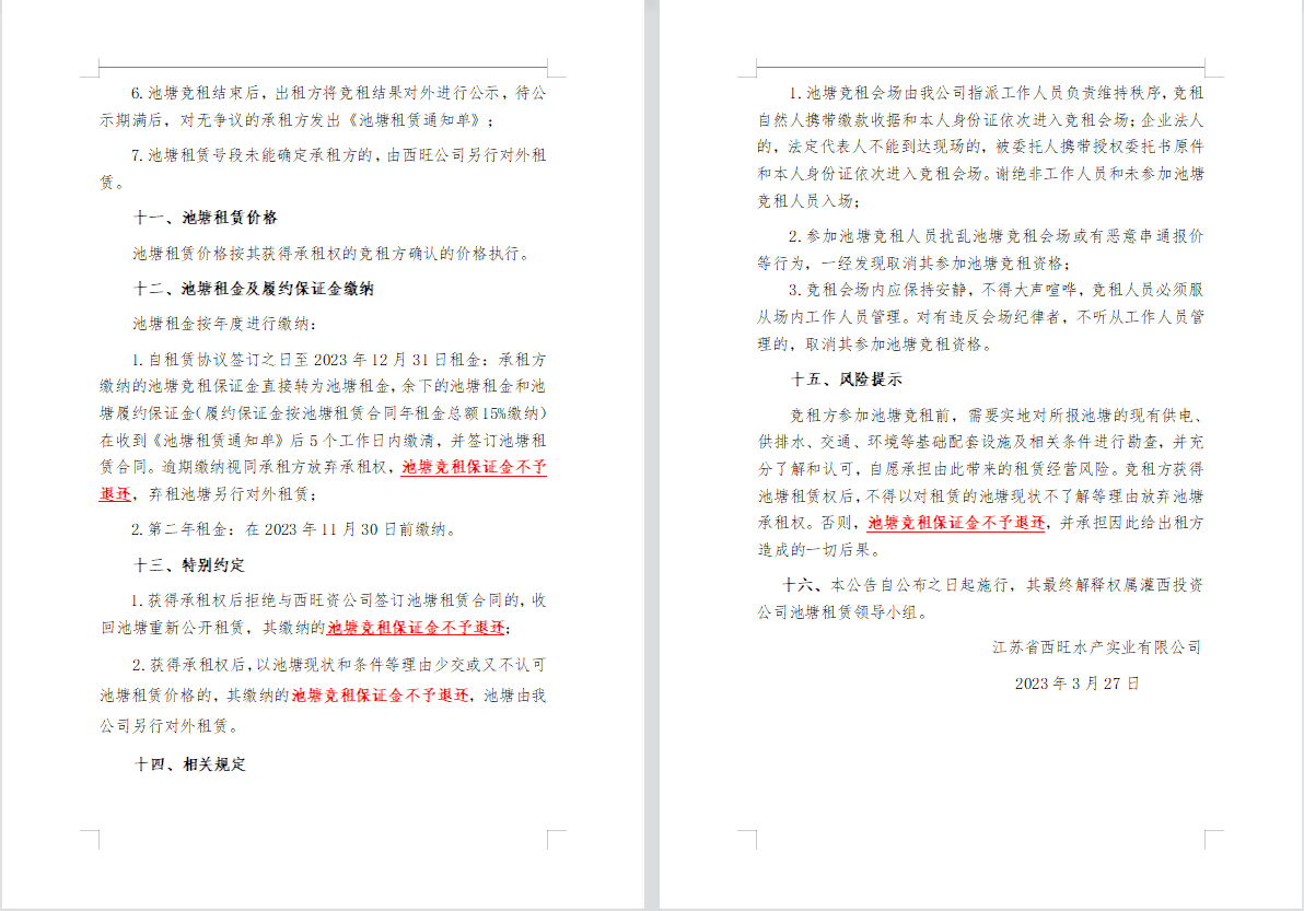 江蘇省西旺水產(chǎn)實(shí)業(yè)有限公司2023年度淡水養(yǎng)殖池塘公開競租第二次公告