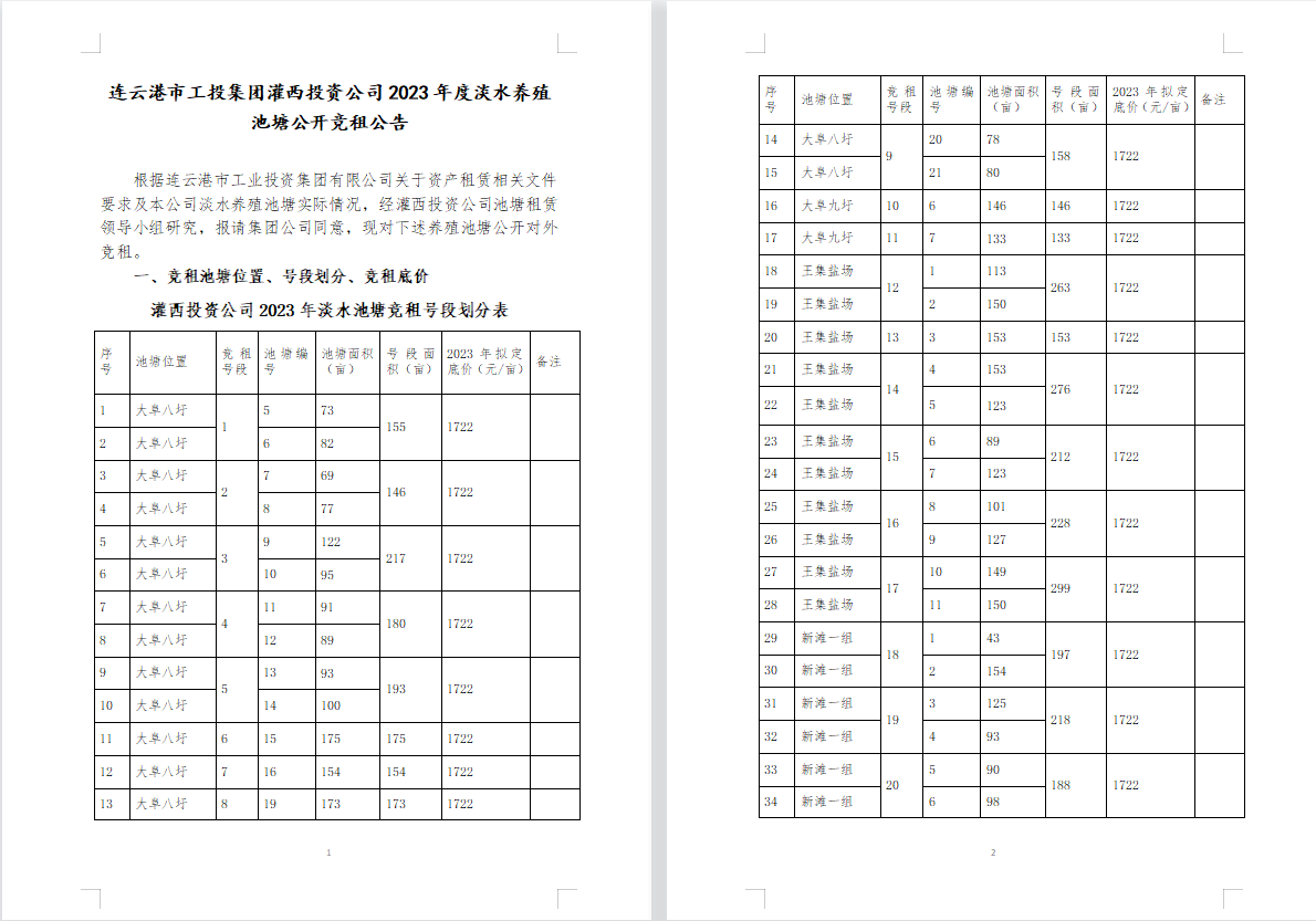連云港市工投集團(tuán)灌西投資公司2023年度淡水養(yǎng)殖池塘公開競(jìng)租公告
