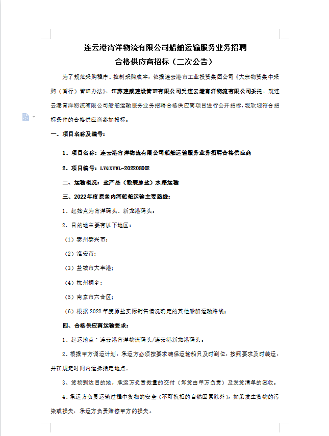 連云港宵洋物流有限公司船舶運輸服務(wù)業(yè)務(wù)招聘合格供應(yīng)商招標(biāo)(二次公告)