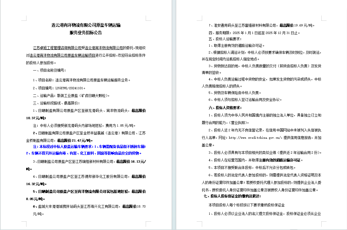 連云港宵洋物流有限公司原鹽車輛運輸服務(wù)業(yè)務(wù)招標公告