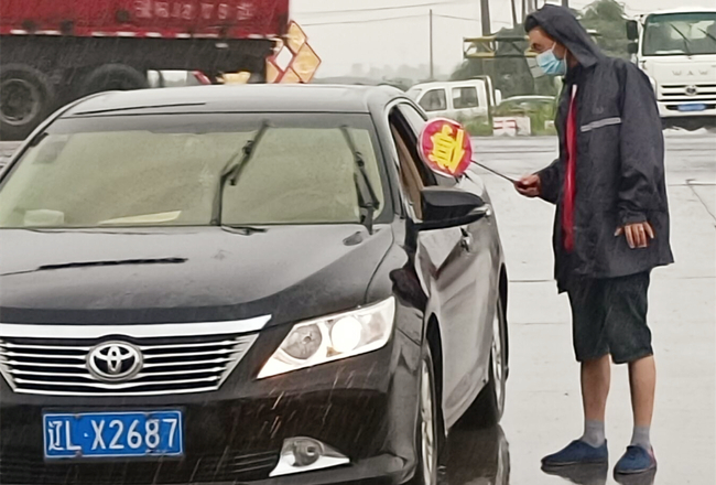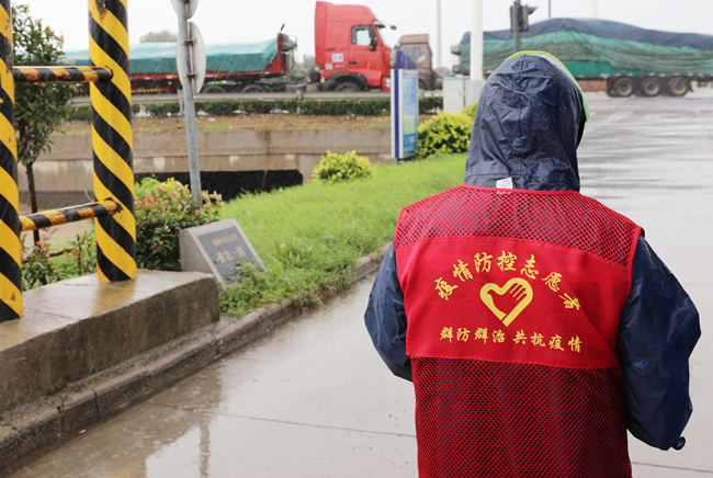 “您好,請出示一下行程碼,做下登記。”堅守在崗位,逆風(fēng)迎雨,對車輛進(jìn)行逐一登記和體溫檢查,絲毫沒有受天氣的影響。