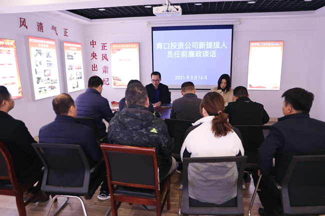 ? ?3月16日下午,青口投資公司紀(jì)委書記朱文兵對(duì)九名新提拔人員進(jìn)行任前集體談話,相關(guān)人員參加了此次會(huì)議。? ? ? ? ? ? ? ? ?