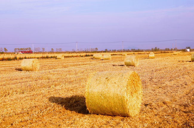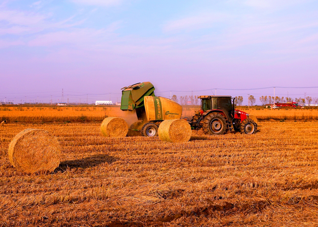 (摟草機(jī)和秸稈打包機(jī)正在地里作業(yè))