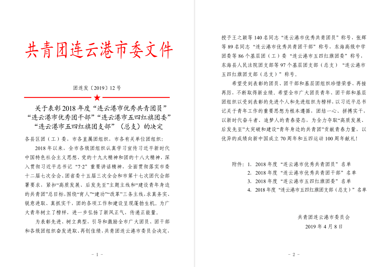 近日,共青團連云港市委員會公布了2018年度“連云港市優(yōu)秀共青團員”“連云港市優(yōu)秀團干部”“連云港市五四紅旗團委”“連云港市五四紅旗團支部”(總支)名單,我公司員工李筠涵榜上有名,被授予“連云港市優(yōu)秀共青團員”稱號。