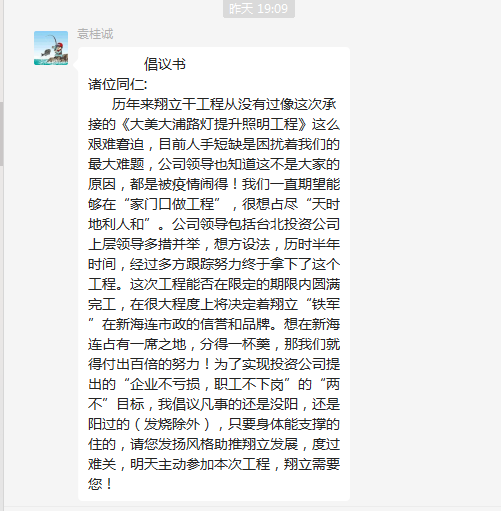 ? ? ? ??運(yùn)籌帷幄,統(tǒng)籌安排。每天早上7點(diǎn)多,都會(huì)看到翔立廠房前的靚麗風(fēng)景線,那是鐵軍們正在進(jìn)行早班會(huì):強(qiáng)調(diào)工作需要注意的安全點(diǎn),進(jìn)行現(xiàn)場(chǎng)分配工作,互相鼓勵(lì)打氣,充分調(diào)動(dòng)大家的積極性;晚上結(jié)束一天勞累的工作,鐵軍們也沒有閑著,在工作群中熱烈的討論工作情況,大家心往一處想,勁往一處使,彼此間相互鼓勵(lì),努力高質(zhì)量的完成路燈工作。雖然疫情影響減員嚴(yán)重,但是大美大浦亮化工程,7條主干道,翔立已經(jīng)完成了6條,大浦路需要把路燈上的方管變成圓管,才能進(jìn)行更換,翔立分公司未雨綢繆,及時(shí)聯(lián)系廠家送來配件,確保工程不停工。