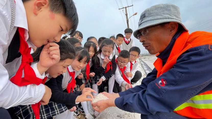 同學(xué)們近距離感受淮鹽的生產(chǎn)過程,聽老鹽工講述過去收鹽的故事。為了感受鹽工的辛苦,同學(xué)們還興致勃勃地穿上膠鞋,來到鹽池中,用耙子扒鹽,用鏟子將結(jié)晶的鹽堆成堆,用手觸摸鹽的質(zhì)地,觀察鹽的結(jié)晶形狀……同學(xué)們不禁感慨小小鹽粒的來之不易。