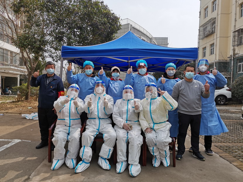 清晨6點30分,1號檢測點,李明同志在檢查物資,“大白”服裝4套、“小藍”服裝6套、棉簽600根……;2號檢測點,于洪亮在將物資上桌,病毒核酸檢測試管、棉簽、消毒液,“還缺少一瓶酒精,我立即反饋給社區(qū),請社區(qū)抓緊安排送來”;4號檢測點,蘇玲、秦黎明正在互相幫忙穿好防護服,“秦姐,這個防護面罩里外有兩層薄膜,我給你撕掉,這樣就不會有霧氣了”,“嗯嗯,你這個拉鏈得拉到頂,我們自己也一定要做好防護”秦黎明溫柔的說;5號檢測點,內(nèi)退黨員孫芳和姜海洋,互相在防護服后背寫上對方的名字,以便于更高效的完成檢測工作;6號檢測點,霍正鋼、朱文健、韓永剛、邱榮濱正在清點檢測小卡片;7號檢測點,張強在拿著酒精給廢物處置垃圾箱消毒;8號檢測點,新加入的孫銀、占恒春、尹永明、韓永光、趙紹慶正在給消殺噴霧劑灌裝84消毒液,社區(qū)8個檢測點的消殺工作全部由昌圩臨時黨支部志愿者負責。