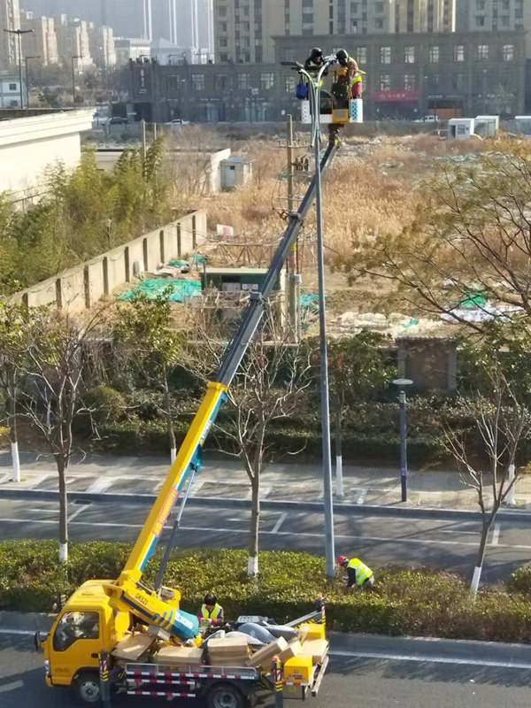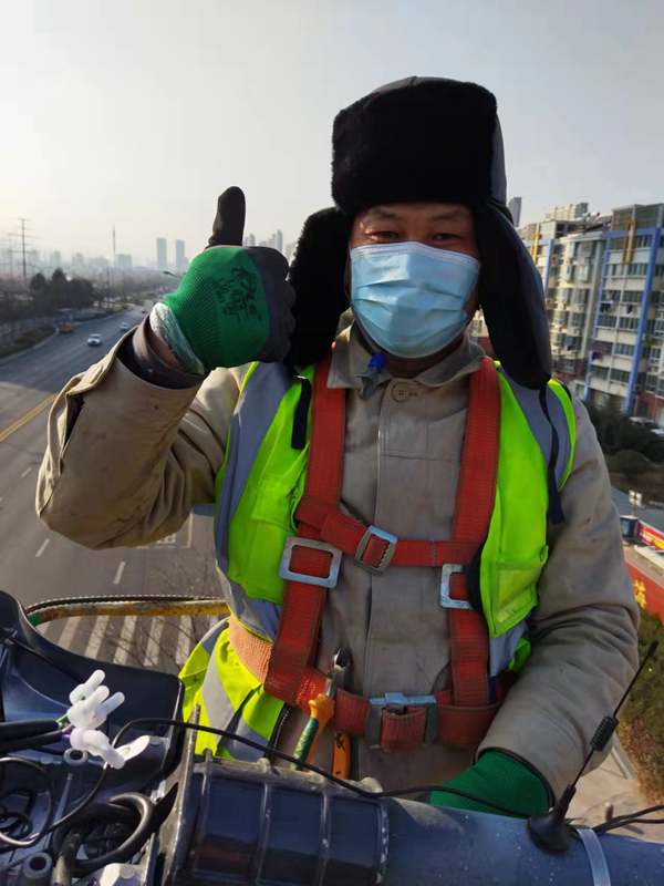 ?該項城市照明提升工程工程量大(約6500套路燈),工期緊。為了趕時間進度,翔立“鐵軍”們由12月27開始施工,日以繼夜、馬不停蹄的連續(xù)奮戰(zhàn)在工程一線,沒有一個人掉隊,沒人喊苦叫累,個個都像鉚足了勁的“小牯牛”。肩帶《安全員》紅袖章的工程負責人喬以成騎著電瓶車不時地在海寧大道上來回穿梭著,“王師傅,高空作業(yè)車四條支撐臂必須支撐平穩(wěn)牢固后再提升哦”,“段青春,把前方施工的警示牌擺在車輛后面,還有道路安全錐桶一定要將作業(yè)區(qū)域圍起來,與后面來車方向保持安全距離。”在市區(qū)人流密集的道路上同時有5臺登高作業(yè)車分區(qū)域高空作業(yè)的情況下,他最放心不下,畢竟是高空作業(yè)!為了防止高空墜落,登高施工操作人員全部按要求規(guī)范佩戴安全帶、系好安全繩、絕緣鞋、防寒安全帽、警示馬甲一應俱全,武裝整齊。為防高空落物,作業(yè)車吊籃內(nèi)使用的工具全部系上“失手繩”,安全施工是必要的前提,有措施,有辦法,畢竟千條萬條,安全才是第一條!