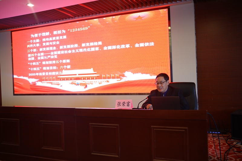 下半場,張校長從一個主題,推動高質(zhì)量發(fā)展;兩件大事,發(fā)展與安全;三個新,新發(fā)展理念、新發(fā)展階段、新發(fā)展格局;新四個全面,全面建設(shè)社會主義現(xiàn)代化國家、全面深化改革、全面依法治國、全面從嚴(yán)治黨;“十四五”規(guī)劃堅持五個原則;“十四五”規(guī)劃目標(biāo),六個新;2035年遠景目標(biāo)建議九項措施等九個方面解讀了全會精神的“新征程 新理念 新格局 新愿景”。