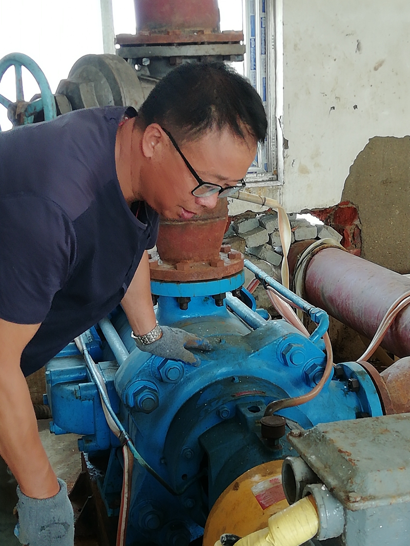 在徐圩運(yùn)鹽河畔,玻璃鋼管道維修現(xiàn)場,發(fā)電機(jī)隆隆轟鳴聲中不時(shí)夾雜著角磨機(jī)刺耳的打磨音,所到之處風(fēng)塵飄揚(yáng)。白色塵霧中,一名五十多歲的中年漢子正凝神專注的低頭操作,仔細(xì)的打磨著玻璃鋼管道接頭的每一片角落,絲毫不敢馬虎。不時(shí),他摘下眼鏡取下戴在嘴上的防護(hù)口罩,鼓起腮幫用力吹去眼鏡上飄落的粉塵。顧不得擦一把額頭上的汗水,戴好眼鏡和口罩,調(diào)整好位置繼續(xù)俯下身打磨,他就是翔立分公司顧圩泵站班組長顧昌全。