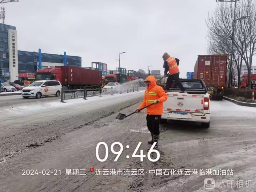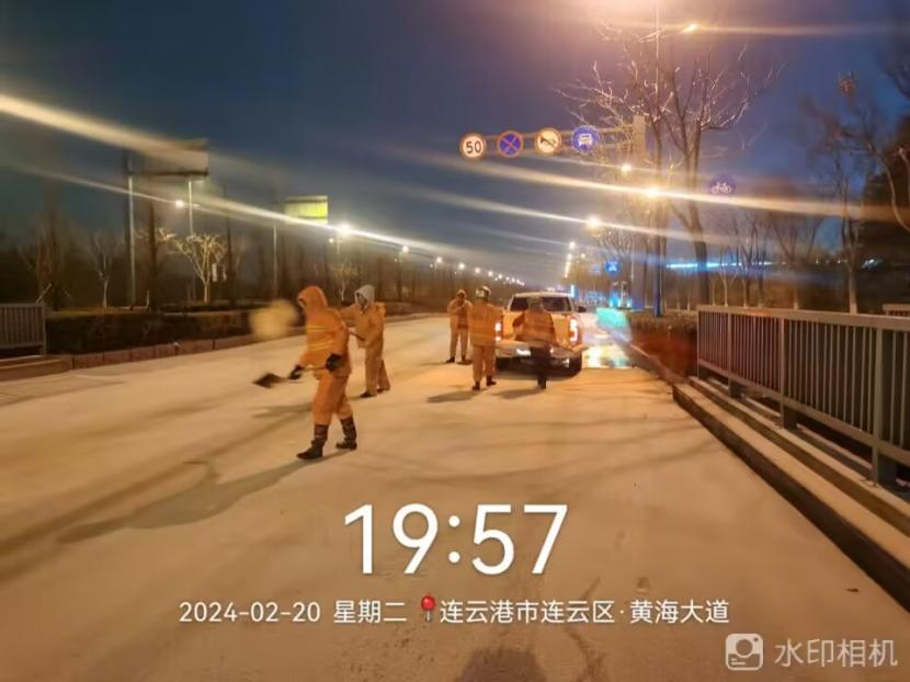 夜晚10點,在黃海大道,支部書記范曉寶親自帶隊,帶領張巖、盛小雷、薛加兵等6名黨員,冒雪奮戰(zhàn)、連續(xù)作業(yè),拋撒融雪劑,進行緊急除雪除冰作業(yè)。