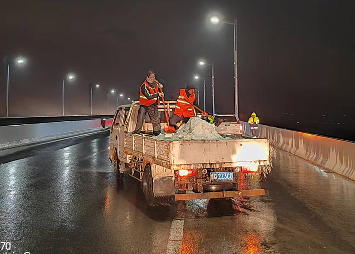 該公司迅速啟動(dòng)突發(fā)天氣應(yīng)急保障預(yù)案,近30余名道路應(yīng)急排險(xiǎn)突擊隊(duì)員,在公司統(tǒng)一按排下 ,裝車備運(yùn)融雪鹽斤近15噸,現(xiàn)場工作中隊(duì)員們士氣高漲,無所畏懼。夜間8時(shí)左右,10余名黨員先鋒,兵分三路再次安全有序奔赴燒香河、海濱大道、228等路段橋梁,無懼大風(fēng)夾著冰雨顆粒吹打臉頰,兩人一對、三人一組、揮動(dòng)手中鐵銑,汗水與冰雨濕透橙色衣衫,經(jīng)過近4個(gè)多小時(shí)努力奮戰(zhàn),人工撒放融雪鹽斤近20余噸,高質(zhì)高效保障近30座橋梁安全通暢。
